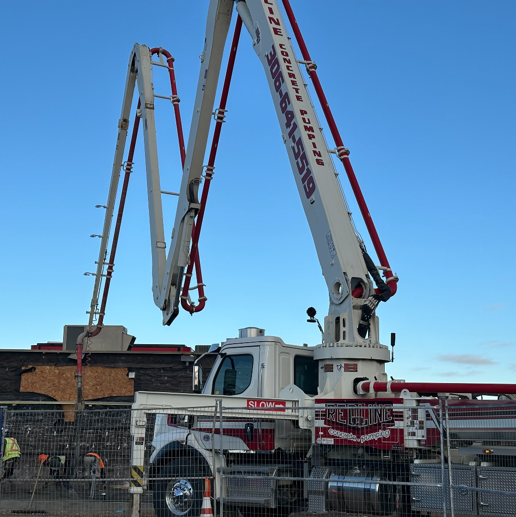 Photo's show the back parking lot of the C-Store, where a concrete semi is parked with a concrete pump truck attached. The concrete pumping truck is parked facing with the S-store where workers are pumping concrete to build the new floor.