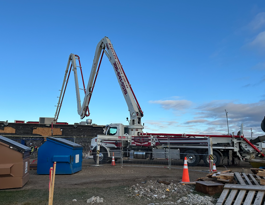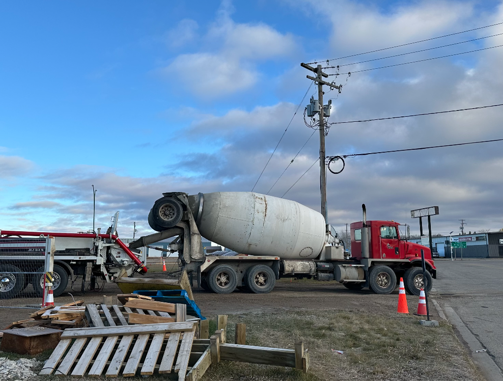 October 29, 2025: Large trucks arrived to pour the concrete to make the new floor for the extension to the Kamsack C-Store.